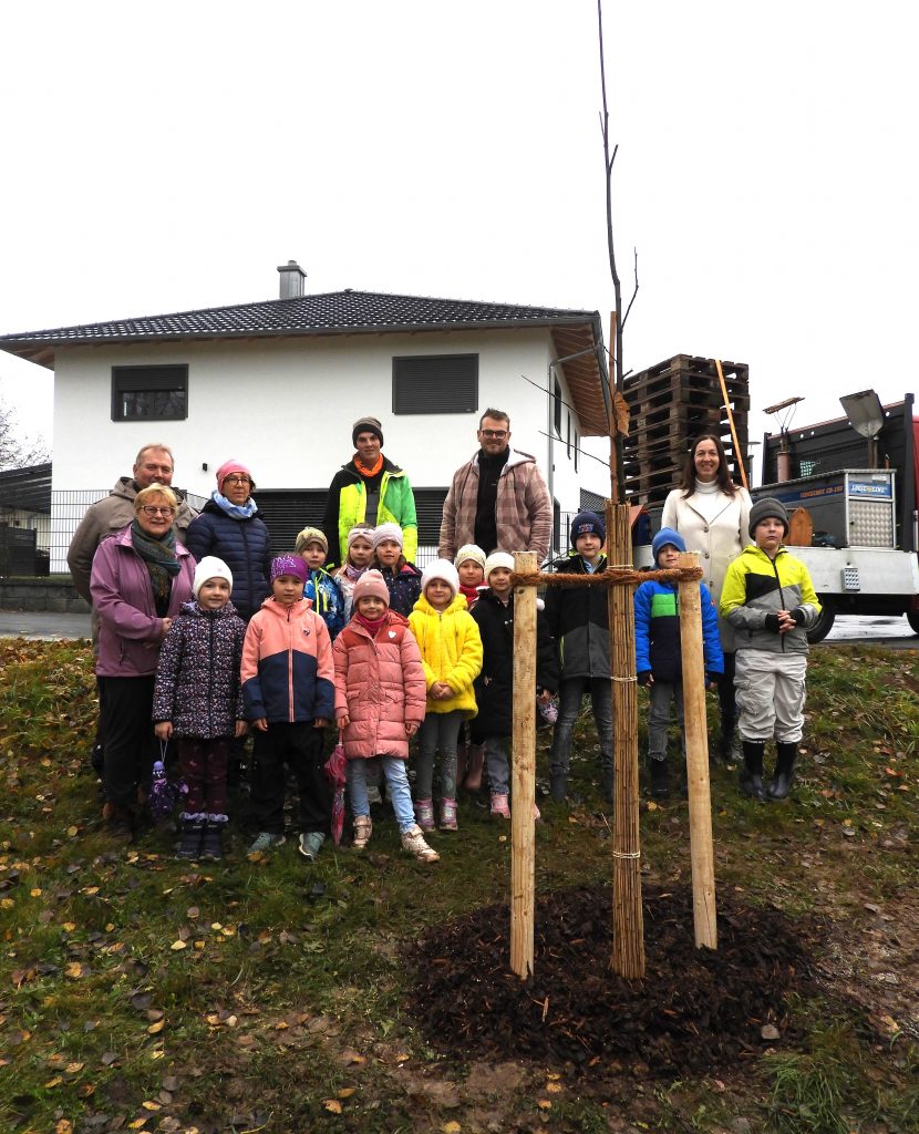 Direkt beim grünen Klassenzimmer wurde ein Kastanienbaum gepflanzt – als sichtbares Zeichen für Nachhaltigkeit und Klimaschutz. „Als Umweltschule fühlen wir uns dem Umweltschutz in besonderer Weise verpflichtet und nehmen diese Aufgabe gerne wahr“, ließ die Pflanz-Truppe wissen. Die ortsansässige Firma Gartenbau Dauer spendete großzügigerweise den Baum. Mit Unterstützung unseres Hausmeisters und Frau Spießl vom OGV verwirklichten wir das Projekt am Montag, 17.11.25.