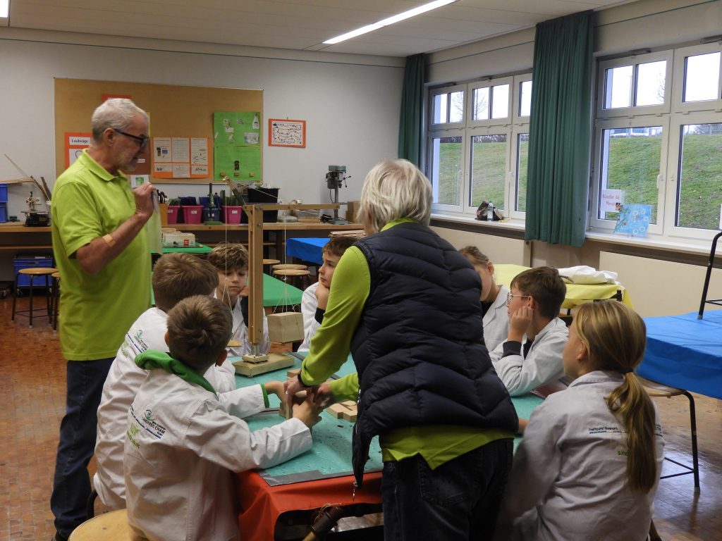 Nach der Begrüßung ging es in der theoretischen Einleitung zum Thema Mechanik, die mit viel Sachverstand von den Ehrenamtlichen schülerverständlich erklärt wurde.