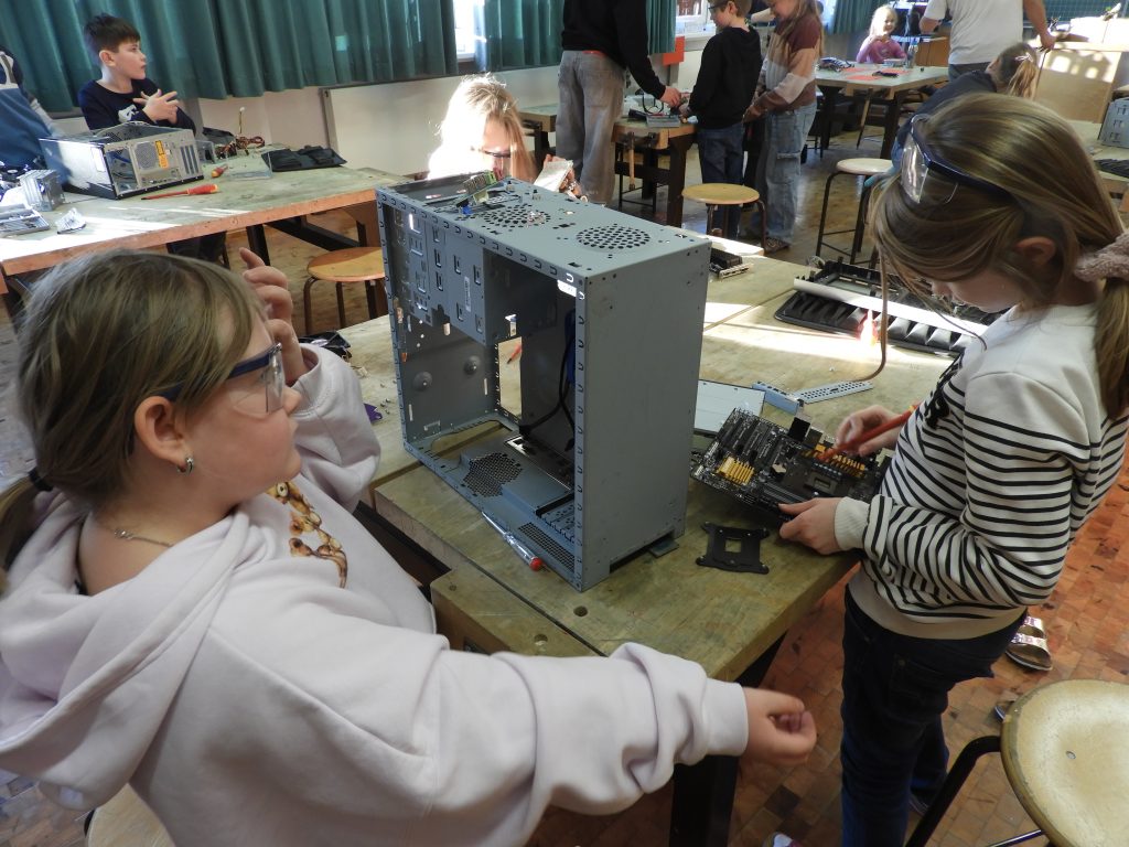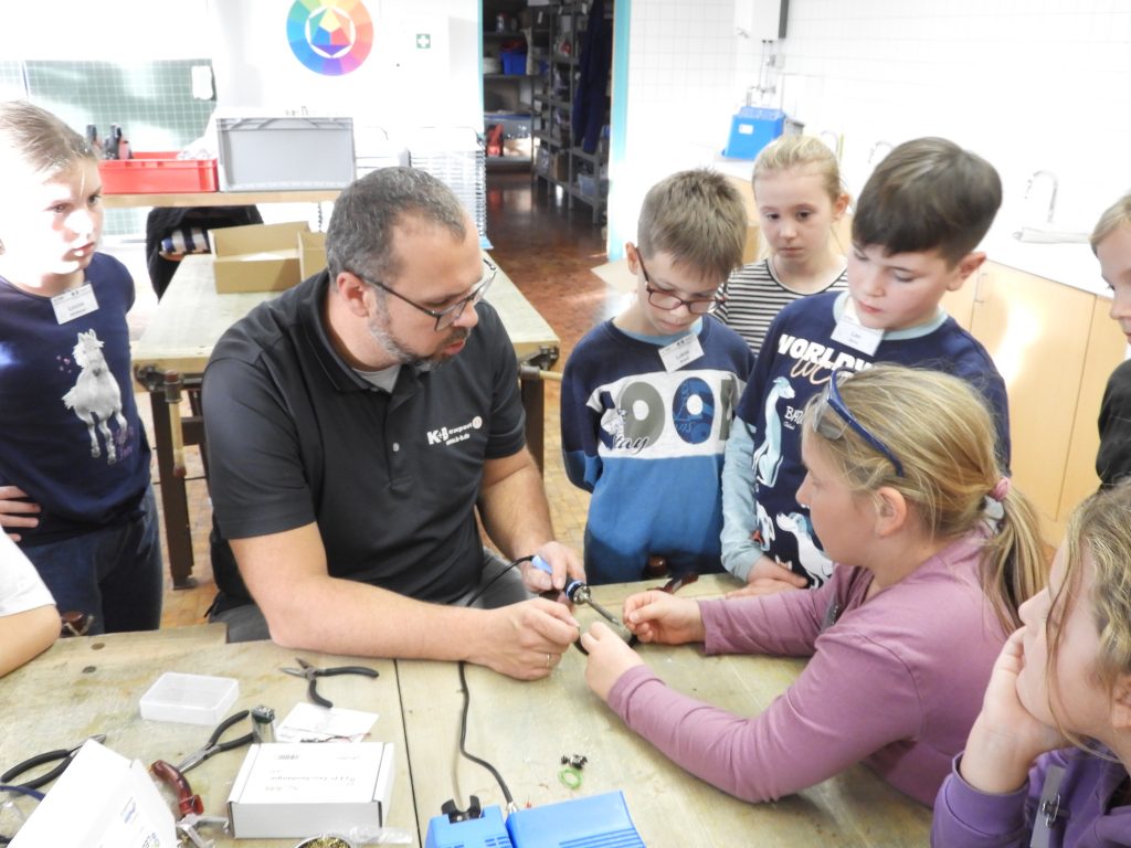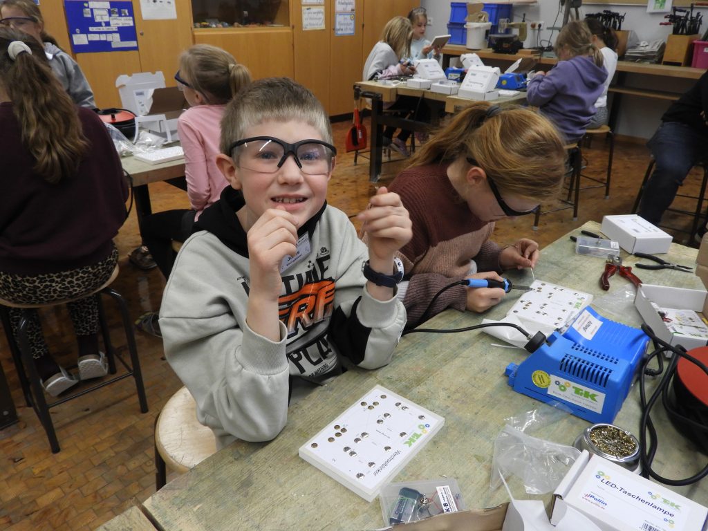 An sechs Nachmittagen fertigten die jungen Techniker selber einfache elektrische Geräte, die sie natürlich mit nach Hause nehmen durften. Anfangs begannen die Schüler mit kleinen Lötübungen zur Einführung, bevor sie eine Platine für eine Taschenlampe hergestellt haben. Und tatsächlich ging dabei bei allen 18 Teilnehmern ein Licht auf. In den nächsten Werkstunden stellten sie noch einen Wechselblinker und eine Kojak-Sirene her, die den Kindern am besten gefielen. Beim letzten Termin wurde ein Computer komplett auseinandergenommen, um sein Inneres zu bestaunen. Für die erfolgreichen Leistungen erhielten die Schüler anschließend eine Urkunde überreicht.