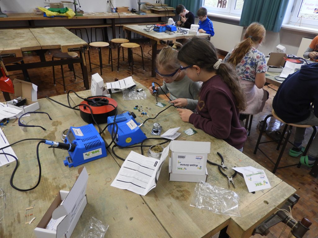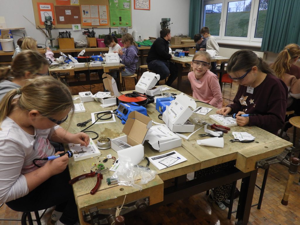 Es raucht und qualmt im Werkraum der Chambtal-Grundschule Weiding, Mini-Sirenen heulen auf. Aber das alles stört die Dritt- und Viertklässler nicht. Mit Freude und Konzentration arbeiten sie mit dem Lötkolben, befestigen Drähte, LEDs sowie Widerstände und freuen sich riesig miteinander, wenn zu guter Letzt am Wechselblinker oder bei der Taschenlampe „die Lichter angehen“.